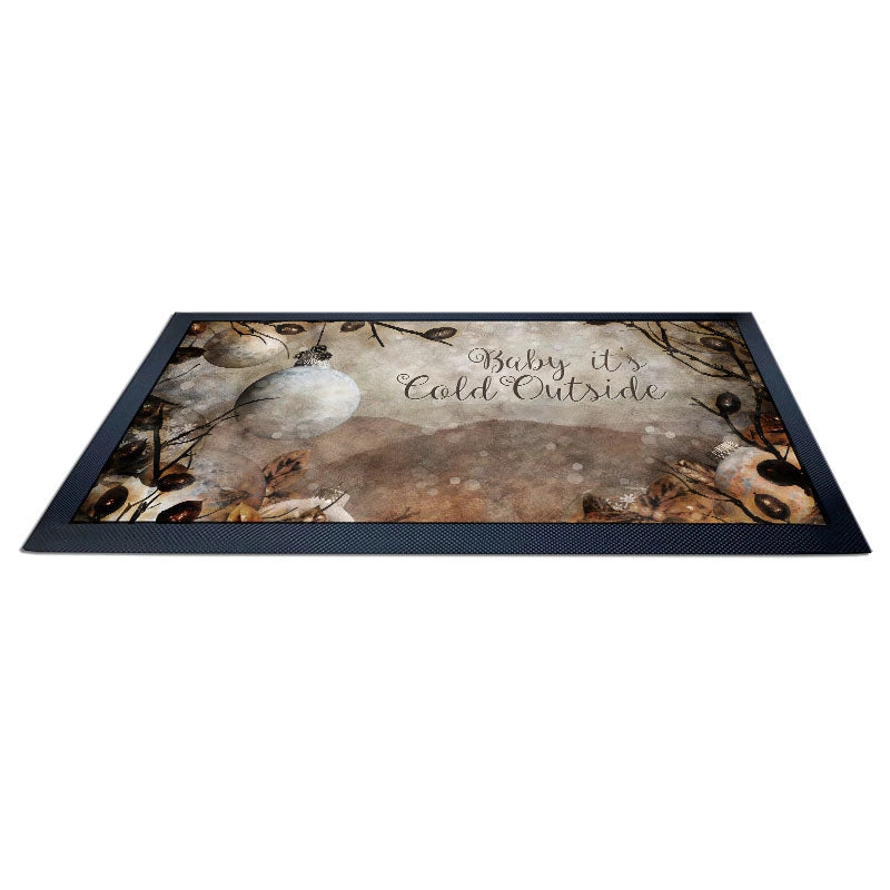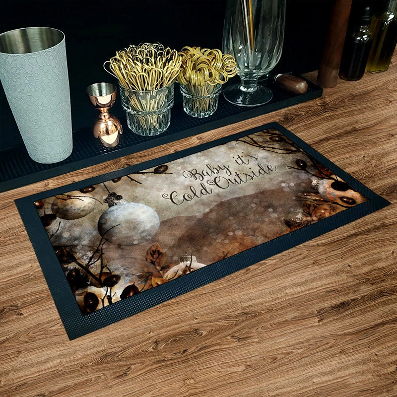 Service mats add a great utility to bar and kitchen tops by protecting them from splatters and spills during high traffic service. The durable rubber matting on the bottom and framing the sides will hold the mat securely in place. This holiday inspired “Baby it’s Cold Outside” design will definitely bring the perfect decor element to your bar or kitchen. These mats can also be used as place settings.