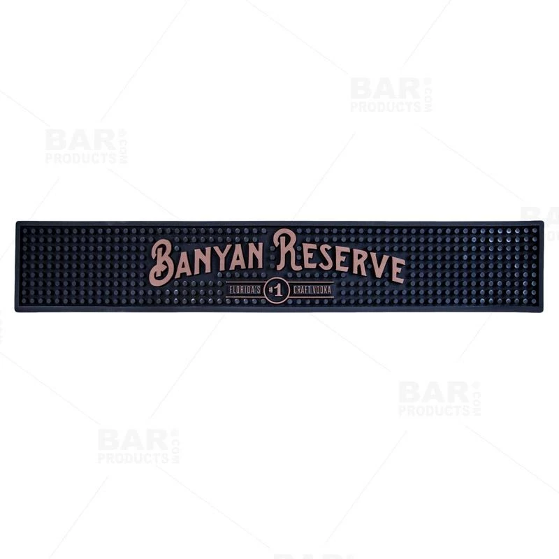 This heavy duty shaker mat is a great way to display some pride for your favorite craft vodka brand, the Banyan Reserve! This long bar mat is durably thick and the perfect solution for keeping your shakers, mixing glasses and other tools sanitary while also keeping your bar tops clean and dry. The bold lettering and pegs are made of the same hard rubber. You can also keep it uncovered to show off the logo! This durable Banyan Reserve bar mat is great for professional use in any bar or restaurant.