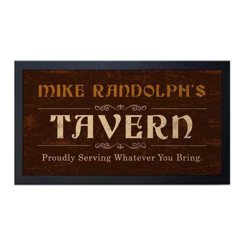 Service mats add a great utility to bar tops by protecting them from splatters and spills during high traffic service. The durable rubber matting on the bottom and framing the sides will hold the mat securely in place. Now you can enjoy the ability to customize your own Bar Service Mat with your name and branding. Among several designs, this easily customizable full color Tavern theme is sure to add a fun decor element to any type of bar setting. Simply type in your text and we do the rest! These mats can also be used as place settings.