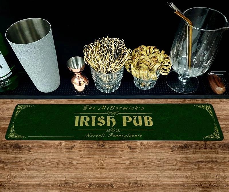 When prepping cocktails, Bar Mats offer a great utility to aid in catching splatters and spills. You will find many bars are aligned with different styles of bar mats to serve this purpose. The matting also secures the glassware in place, allowing for a better mixing environment. Now you have the ability to “full color” customize your very own bar mat. This mat offers a rubber backing and a soft polyester face that will absorb liquids while still showcasing your “Irish Pub” branded design. Simply type in your text, we do the rest!