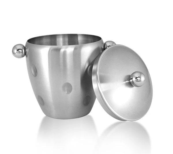 Our Dimpled Ice Bucket with Lid holds approximately 56 ounces or 1.75 quarts. It features a brushed stainless steel finish with dimple accents. The complete bucket with lid stands 7.5 inches tall. The width from knob to knob is also 7.5 inches. A stylish accessory for your home bar.