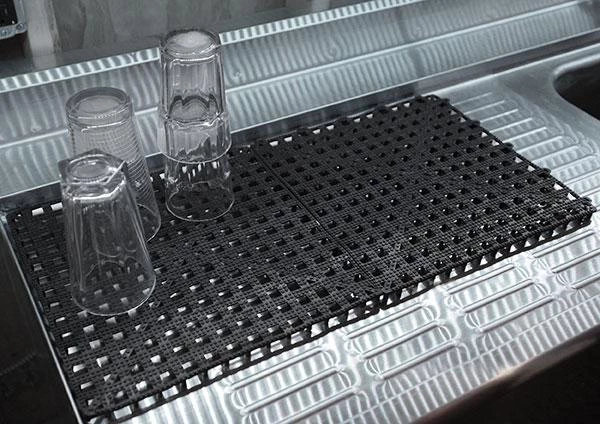 These 12″ x 12″ interlocking bar shelf mats snap together with each other and can be cut to accommodate any work space. The legs underneath the mat creates a 9/16th inch space that allows air in for quicker and more sanitary drying and enough room so that spills don’t touch whats on them. Great for bars, restaurants, diners, hotels, and more. These interlocking mats clean up easily and come in four colors: Green, Red, Black, and Blue.
