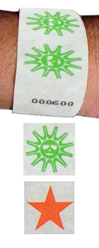 Club owners and party managers use colored, numbered wristbands to track door profits, drinking ages, and VIPs. This wide range of selection features 1 inch wide bands made of strong, waterproof Tyvekยฎ material and come in several colors and designs. All come in self-dispensing boxes of 500. Keep your door honest and your count accurate by alternating colors for different nights or events and utilize the number count system. Band come in solid colors, a star pattern, and a decorative sun pattern.