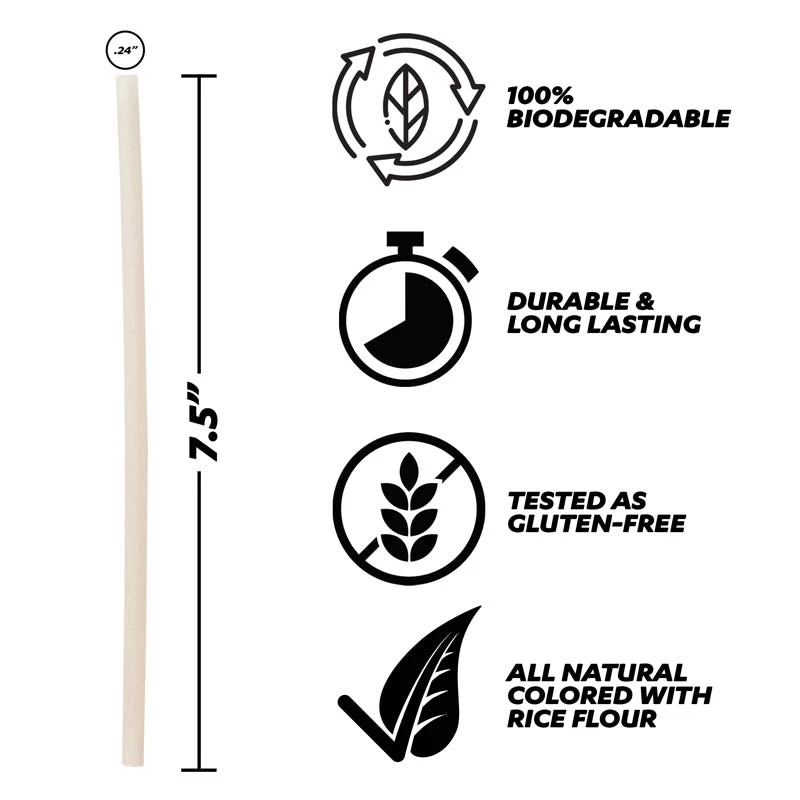 Made of rice flour, tapioca starch, and plant based ingredients that are flavorless in beverages and tested as gluten-free. Meaning that they are not only good for you but also for the environment. 100% biodegradable breaks down naturally, unlike paper and plastic straws. Designed to last 30+ minutes in cold beverages. They make a great alternative to disposable plastic and paper straws so buy a box today and give your patrons a fun new drinking experience! Measures 7.5”