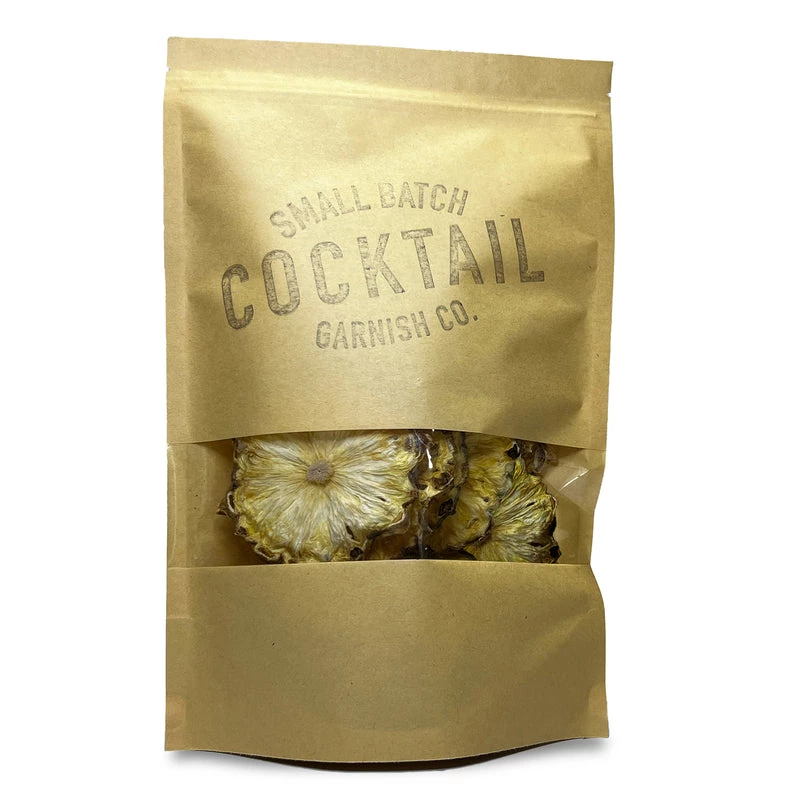 Our Pineapples are dehydrated with no added ingredients. These rings come to life when used in contrast to any bright colored cocktail, or blend well with a classic Mai Tai! Each bag contains 14 slices.