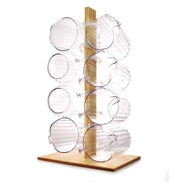 Stop storing your beer and water pitchers in messy piles. Instead, store them on this convenient wooden rack. This rack holds approximately 8 pitchers of almost any size in a vertical fashion so they are not in the way. Handmade in the USA.